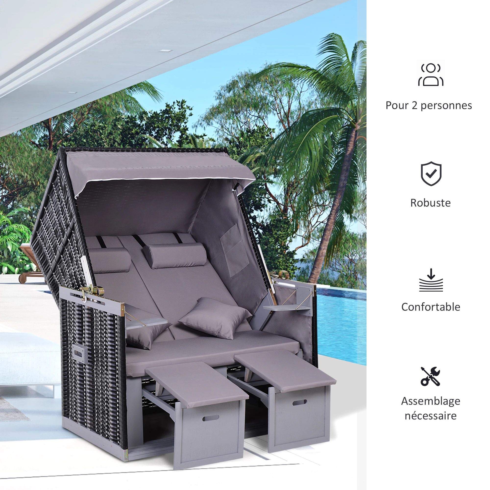 Cette chaise relax extérieure 2 places d’Outsunny mélant résine tressée et bois massif ajoutera une touche d’élégance à votre extérieur. Doté d’un dossier réglable à 5 niveaux et de 2 repose-pieds rétractables, assise, dossier rembourrés de mousse épaisse haute densité, 2 tétières et 2 coussins lombaires amovibles intégrés, ce transat de jardin vous apportera un grand confort d’utilisation. Installez-le dans votre jardin ou terrasse, profitez d’un moment de détente avec votre famille ou ami !
